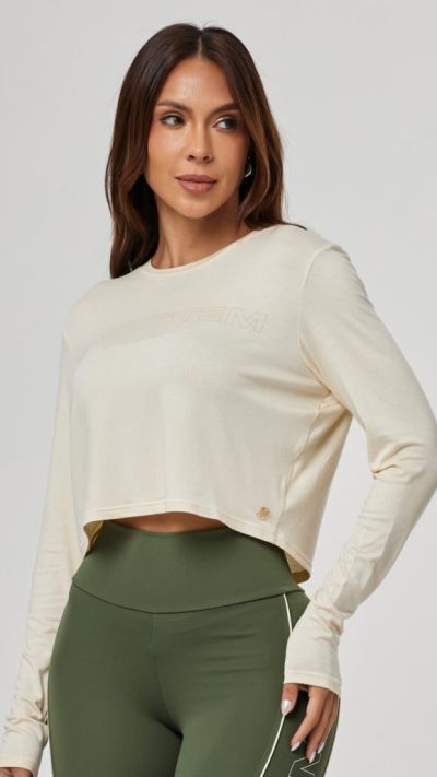 A Blusa Manga Longa Dry Fit Set possui modelagem slim e comprimento cropped, sendo uma peça atemporal e perfeita para diversas ocasiões.